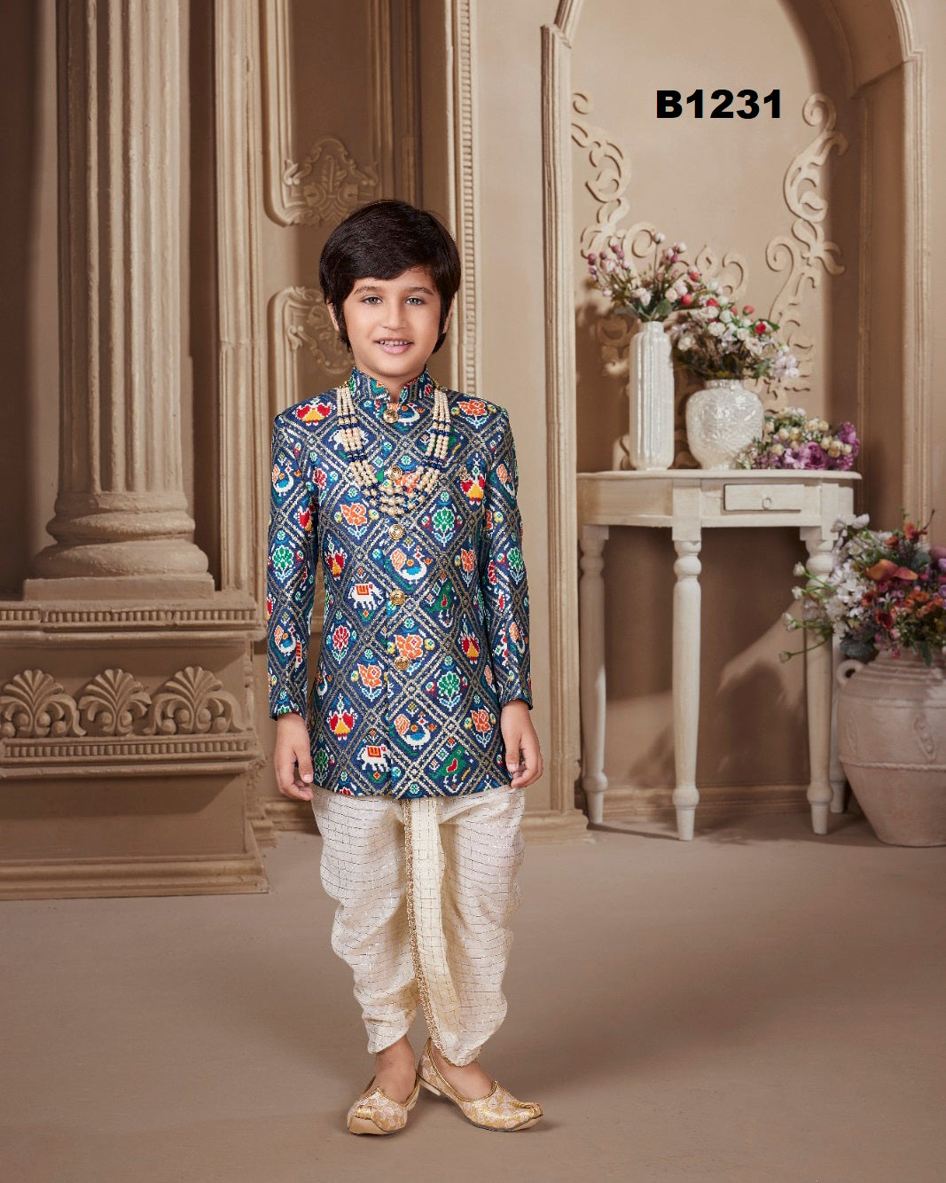 A Blue Patola Printed Sherwani is a great option for a stylish and modern look. The print of the traditional Patola design on the Sherwani gives a nod to the classic pattern while offering a more contemporary feel. The blue color adds a calming and soothing touch, perfect for making a statement at any event. If you're looking to add some flair to your wardrobe, a Blue Patola Printed Sherwani is definitely a great choice!