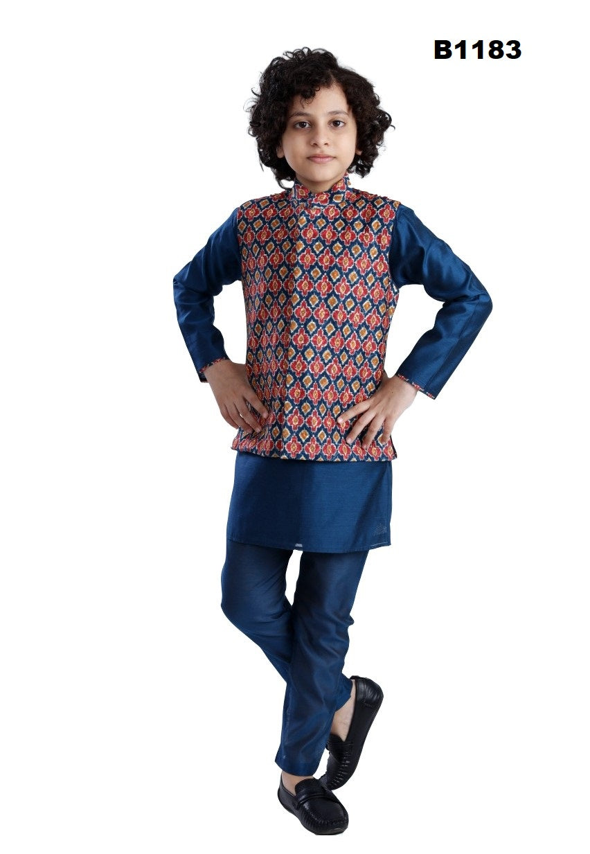 B1183 - patola style cotton Silk waist coat set with solid bluw kurta pajama