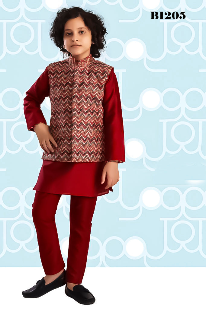 B1205 - Solid Bright maroon silk kurta pajama with embroidered chevron design waist coat set