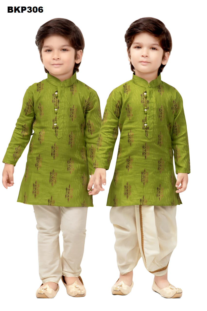 BKP306 - Green and offwhite cotton kurta pajama and dhoti 3 - piece combo set
