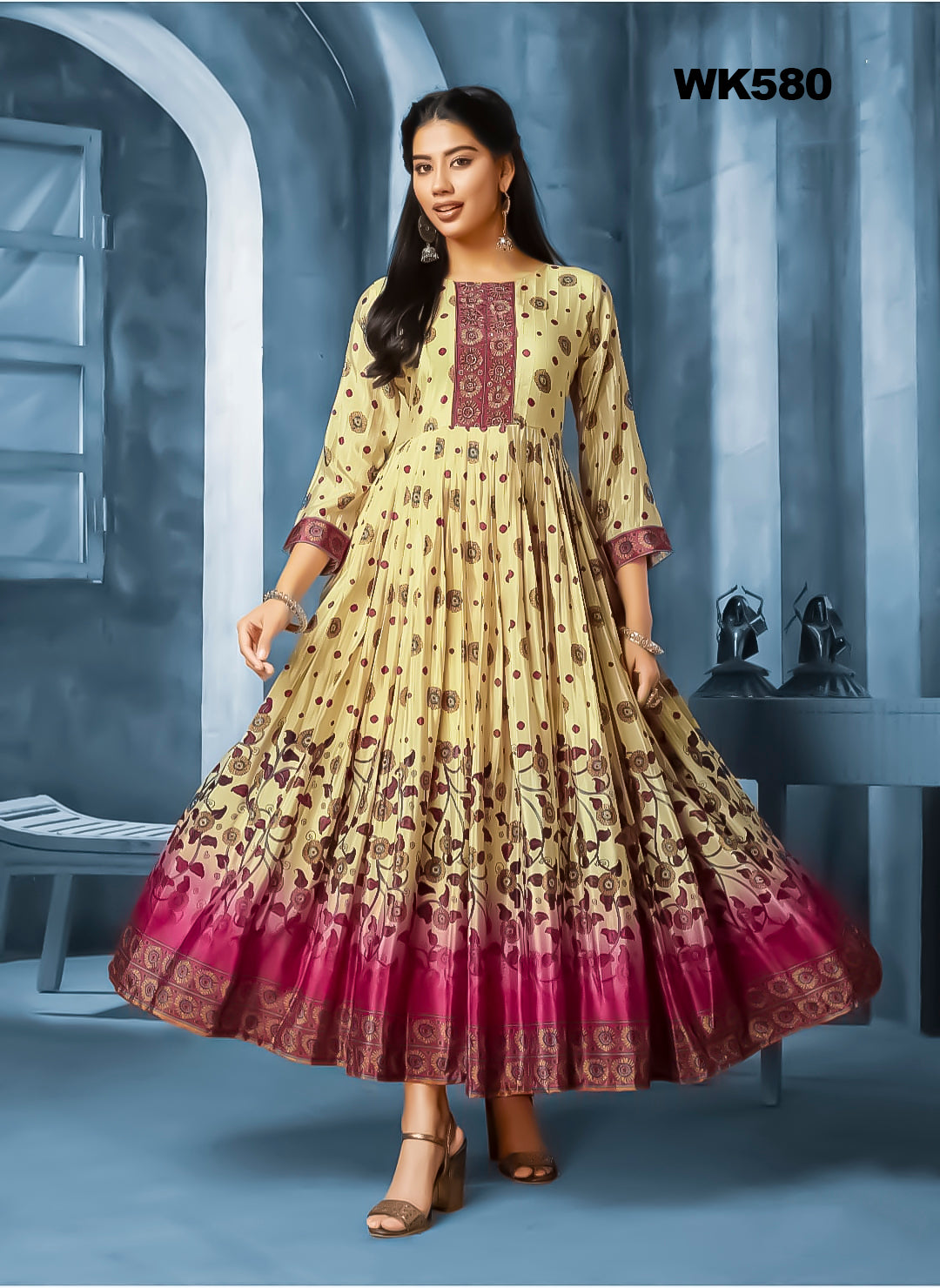 WK580 - Yellow pink hued satin silk long Anarkali Kurti