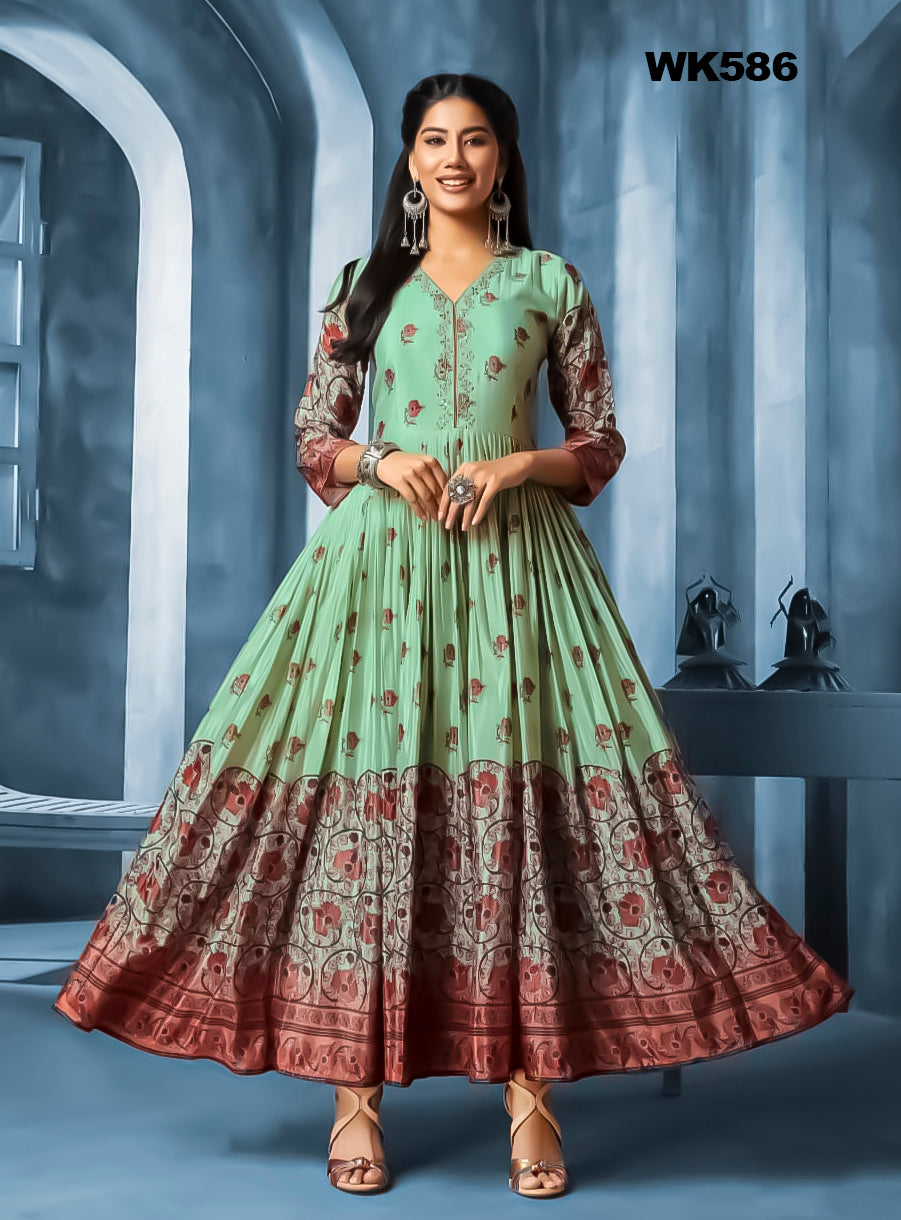 WK586 - Green and Brown hued printed floral anarkali Kurti