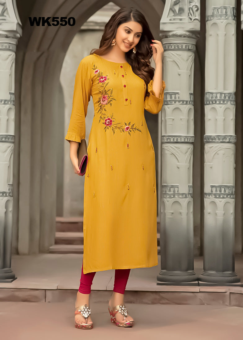 WK550 - Yellow Rayon Kurti with thread embroidery