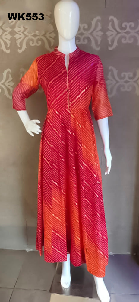 WK553 - Shaded Red and gold Leheriya printed cotton kota Kurta