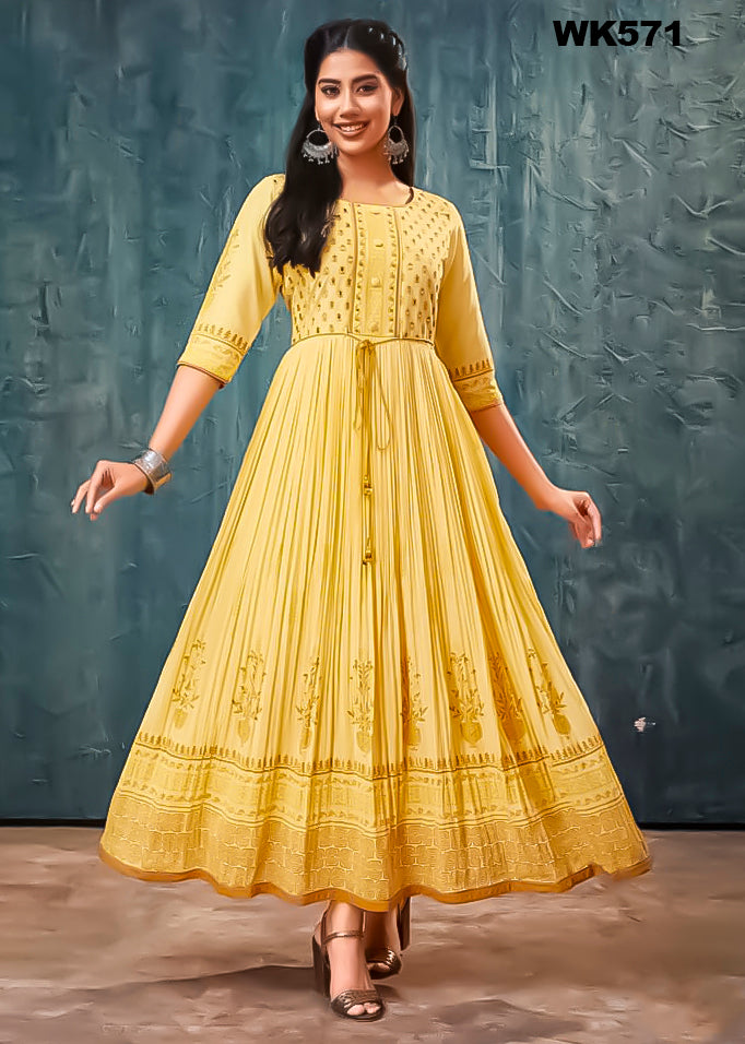 WK571 - Pale yellow soft linen cotton Anarkali long Kurti
