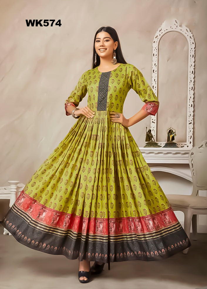WK574 - Green Muslin Silk printed Anarkali Kurti