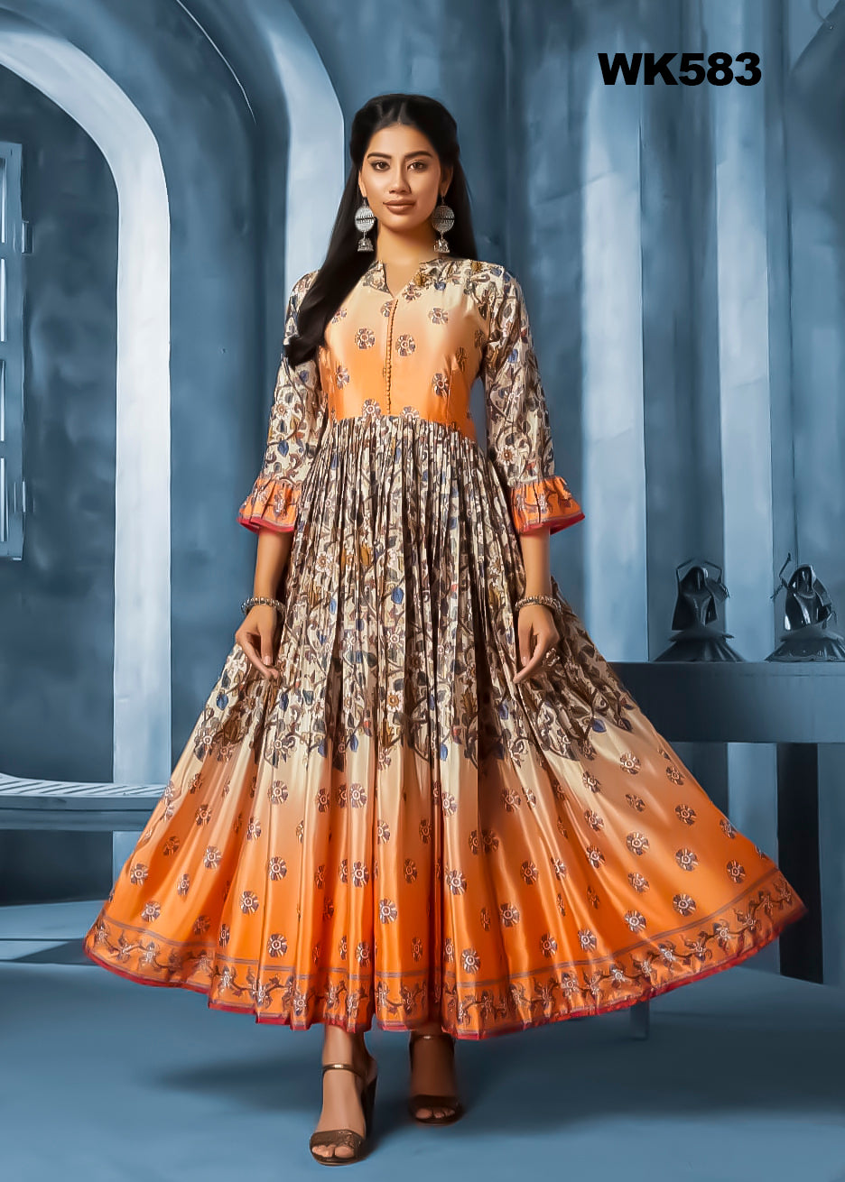 WK583 - Orange shaded Floral printed Anarkali Kurti dress